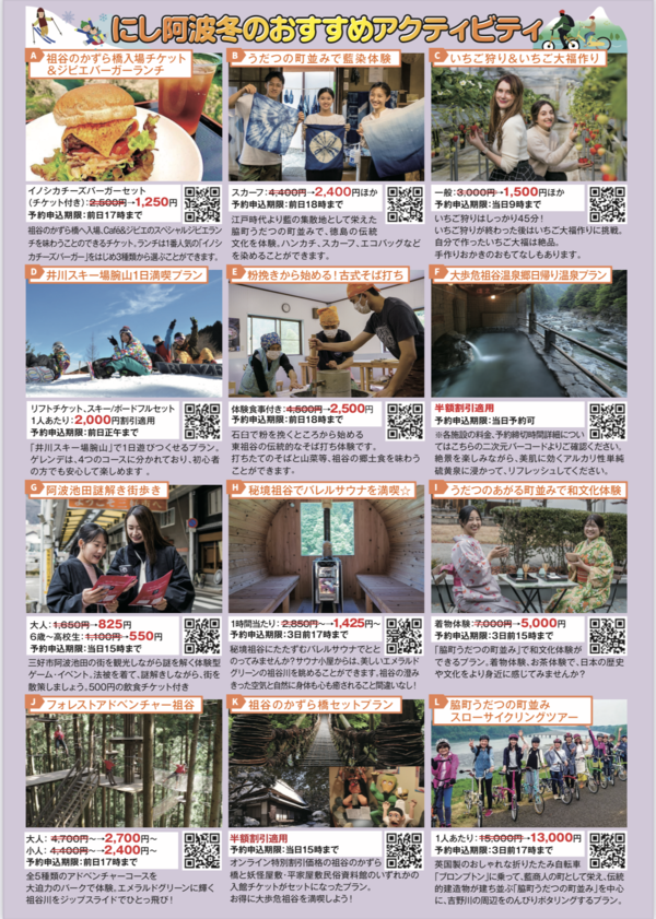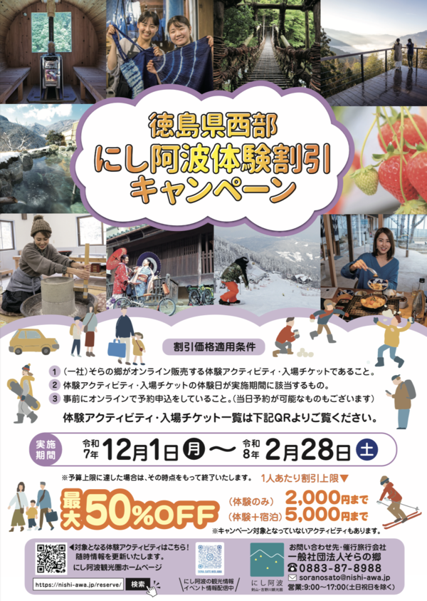 (お一人様あたり:体験のみ上限2,000円 / 体験+宿泊上限5,000円)と、 大変お得ににし阿波のアクティビティをお楽しみいただけます。 詳細につきましては、下記URLおよび別添のチラシをご覧ください。