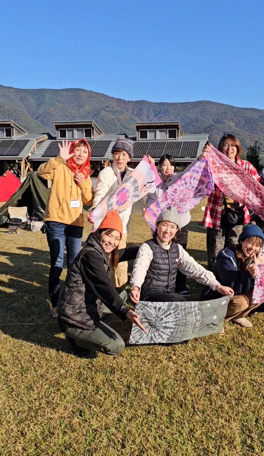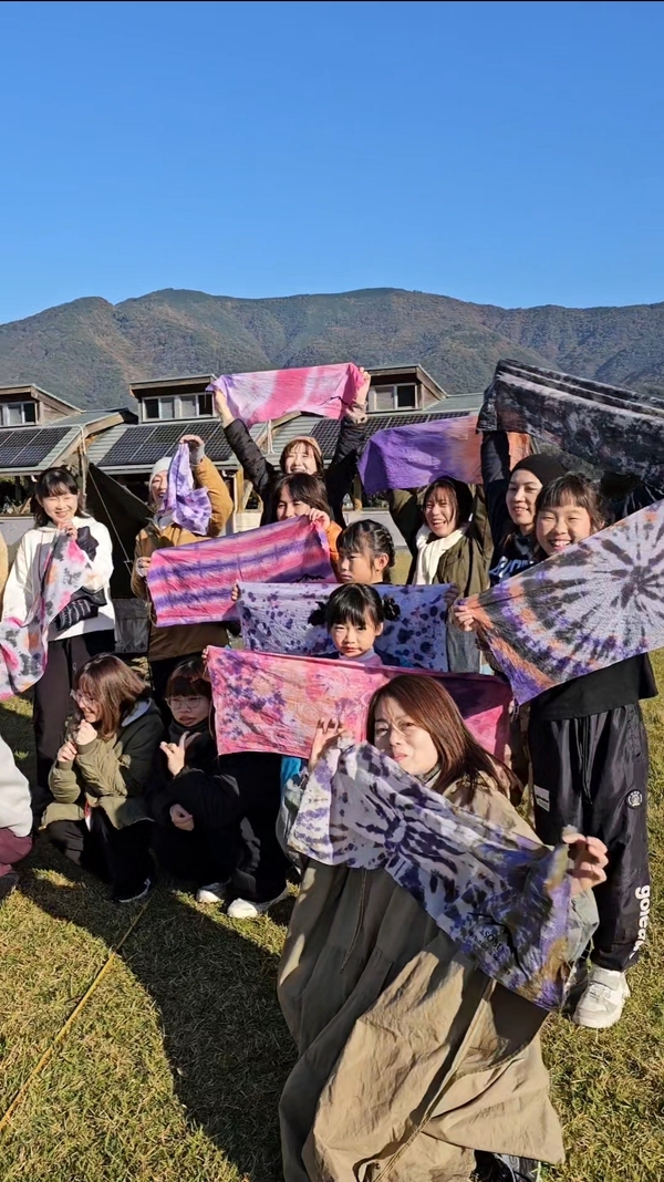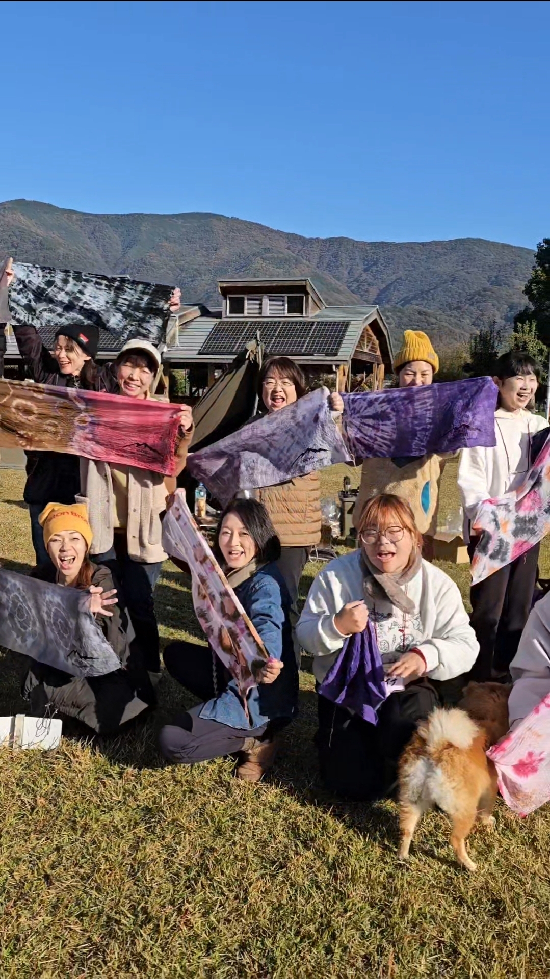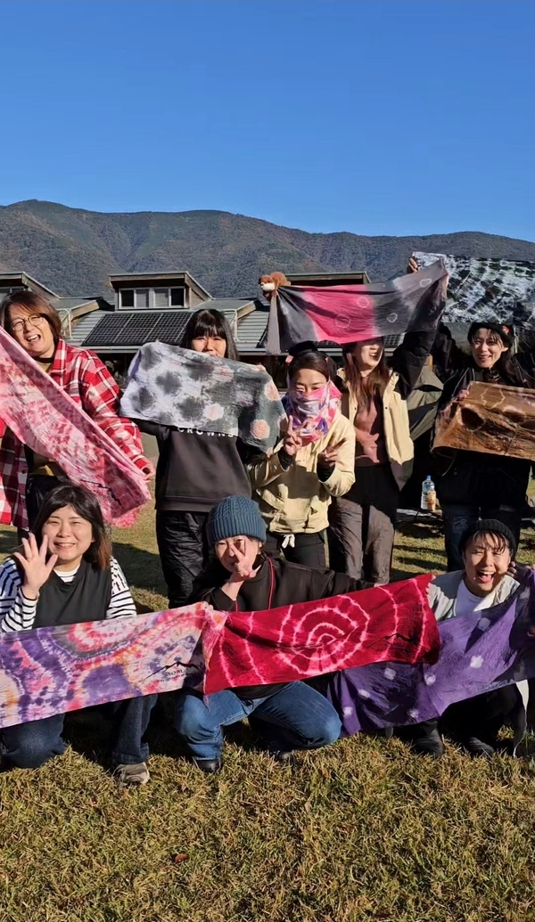ワークショップで染め上げた手ぬぐいを集めて記念撮影。